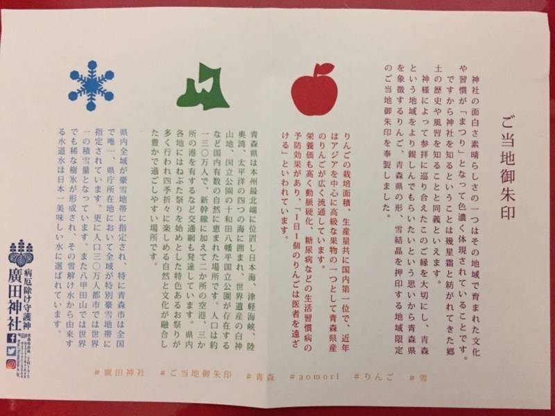廣田神社 病厄除守護神 בטוויטר 神様によって参拝に巡り合えたご縁を大切にし 青森という地域をより親しんでもらいたいという思いから 青森 県を象徴するりんご 青森県の形 雪の結晶の御朱印を奉製しました