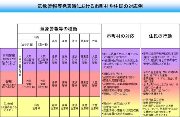 大雨 洪水に関する警報や注意報について 気象に関する警報や注意報 警報には 大雨 大雪 洪水 暴風 暴風雪 波浪 高潮 の7種類があり 注意報の数はこれより多くなります いずれも都道府県を細かく分けた地域ごとに発表