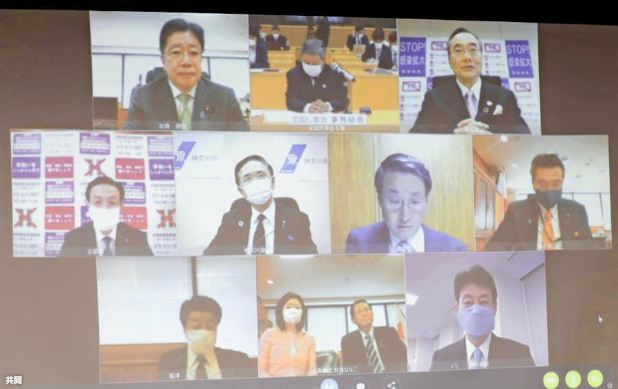 テレビ会議方式で行われた全国知事会の新型コロナウイルス対策本部会合 画面の上段左は全国知事会長の飯泉嘉門徳島県知事 12日午前 東京都千代田区 写真 西日本新聞ニュース