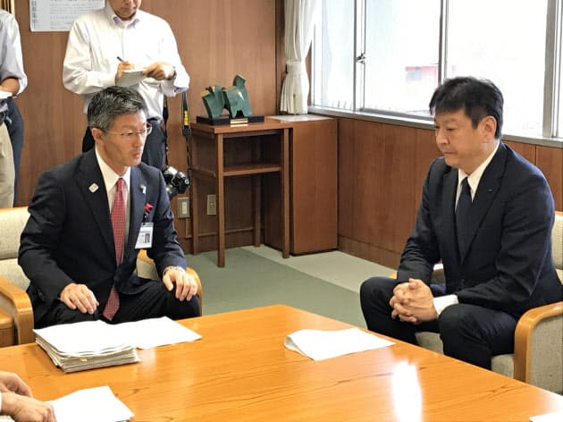 東電の小早川智明社長 右 と面会する新潟県柏崎市の桜井雅浩市長 15日午前 柏崎市役所 写真 西日本新聞ニュース