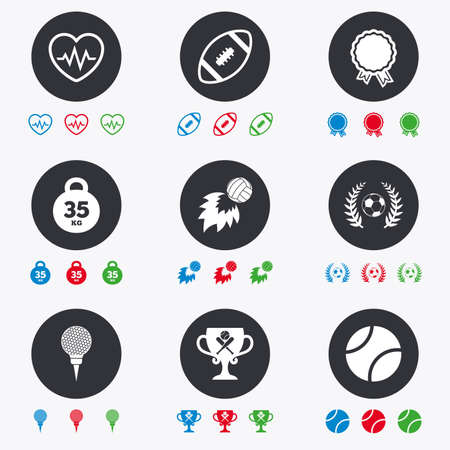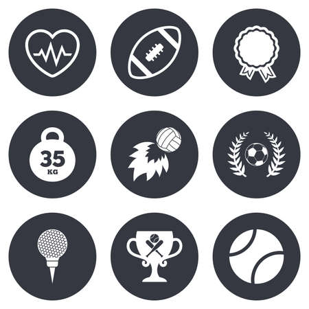 スポーツ ゲーム フィットネス アイコン サッカー ゴルフ 野球のサイン ハートビート ラグビーおよび月桂樹の花輪のシンボル 古典的なシンプルなフラット アイコン のイラスト素材 ベクタ Image