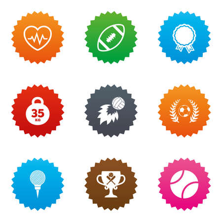 スポーツ ゲーム フィットネス アイコン サッカー ゴルフ 野球のサイン ハートビート ラグビーおよび月桂樹の花輪のシンボル フラット アイコンを持つ星ラベル ボタン ベクトルのイラスト素材 ベクタ Image