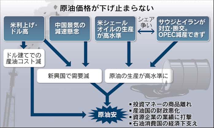 進む原油安 実体経済揺さぶる 日本経済新聞