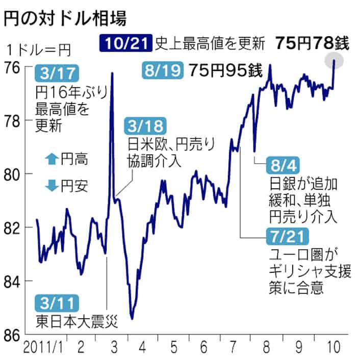 円高長期化の様相 最高値更新 一時75円78銭 日本経済新聞
