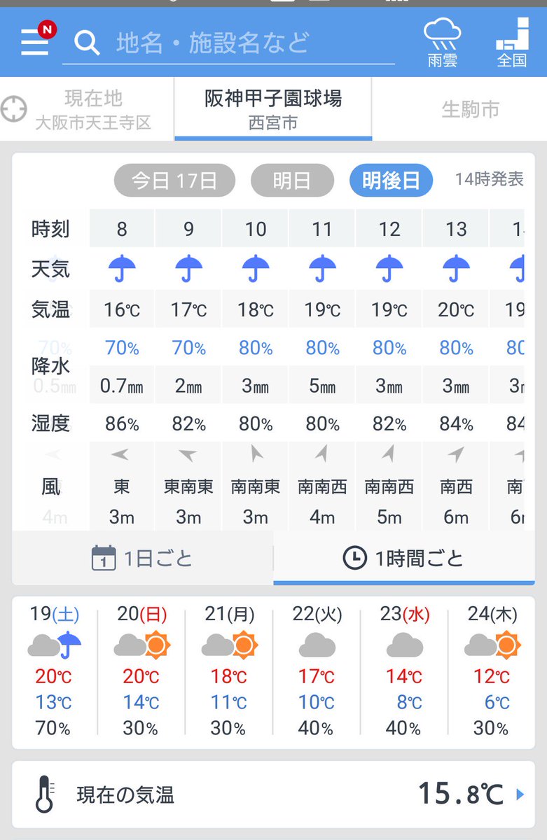 ねこ1号 على تويتر Yahoo 天気の 今日の14時現在の予報だと 土曜日の阪神甲子園球場の午前11時は 5 の雨量 予報通りだと無理だろうけど 前々日の予報は ハズレることも よくあるので 風も南西の風6mは 強めの浜風 阪神内野陣がフライを落とす時の風